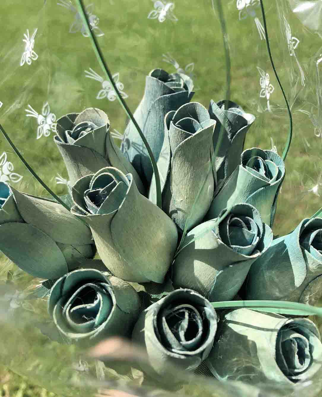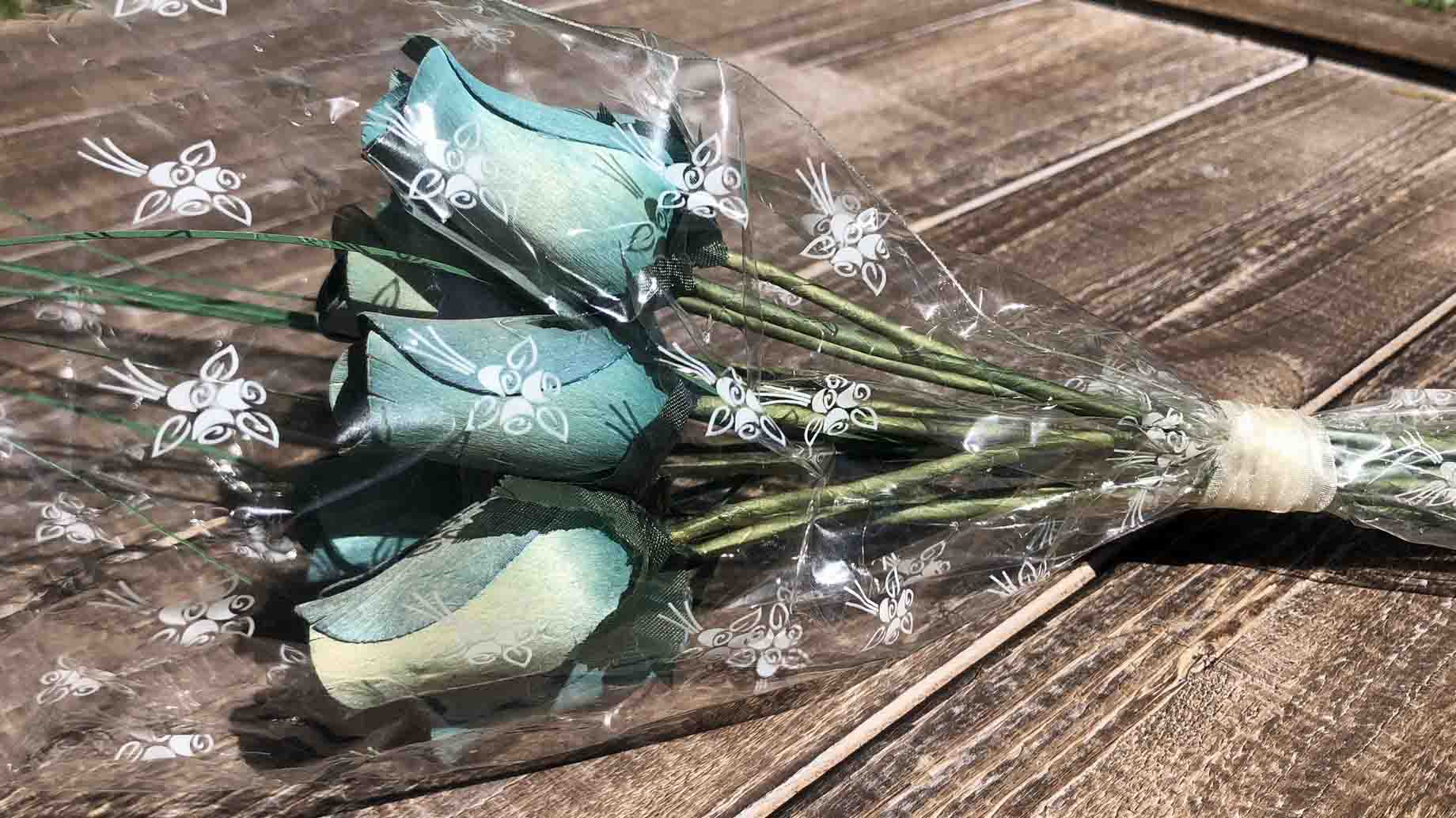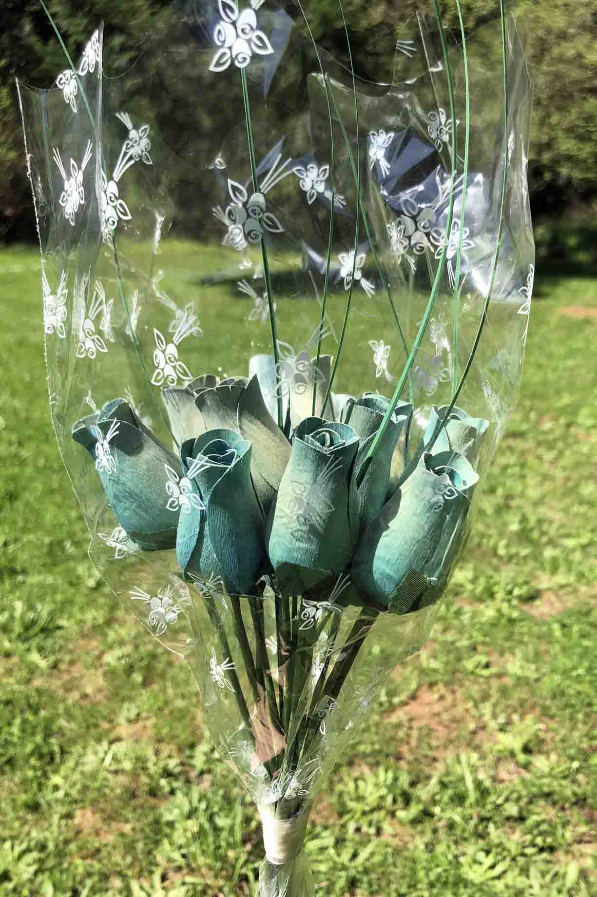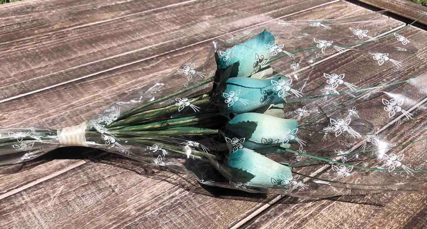 - Complete bouquet includes 12 washed denim blue rosebuds, onion grass, cellophane sleeve and ivory ribbon