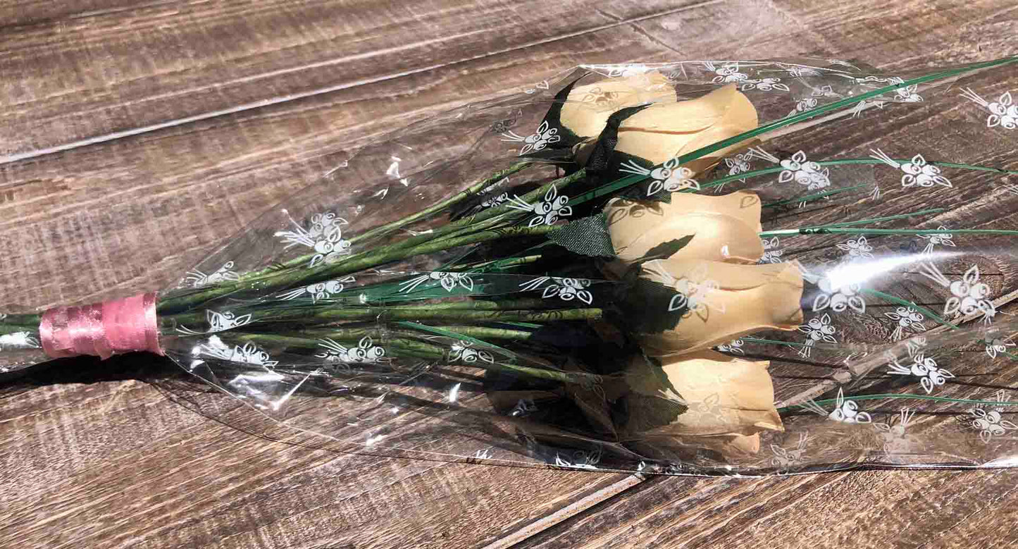 - Complete bouquet includes 12 ivory rosebuds, onion grass, cellophane sleeve and pink ribbon