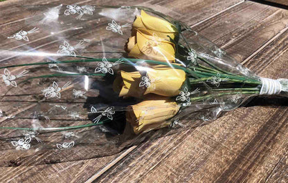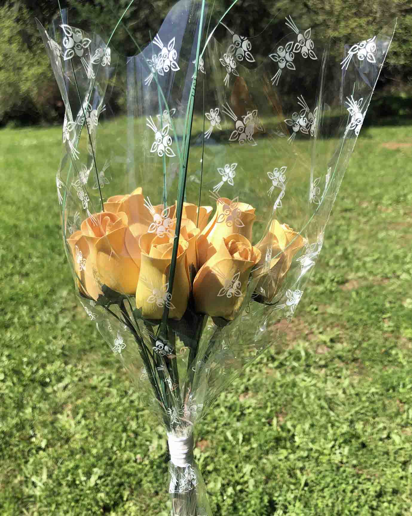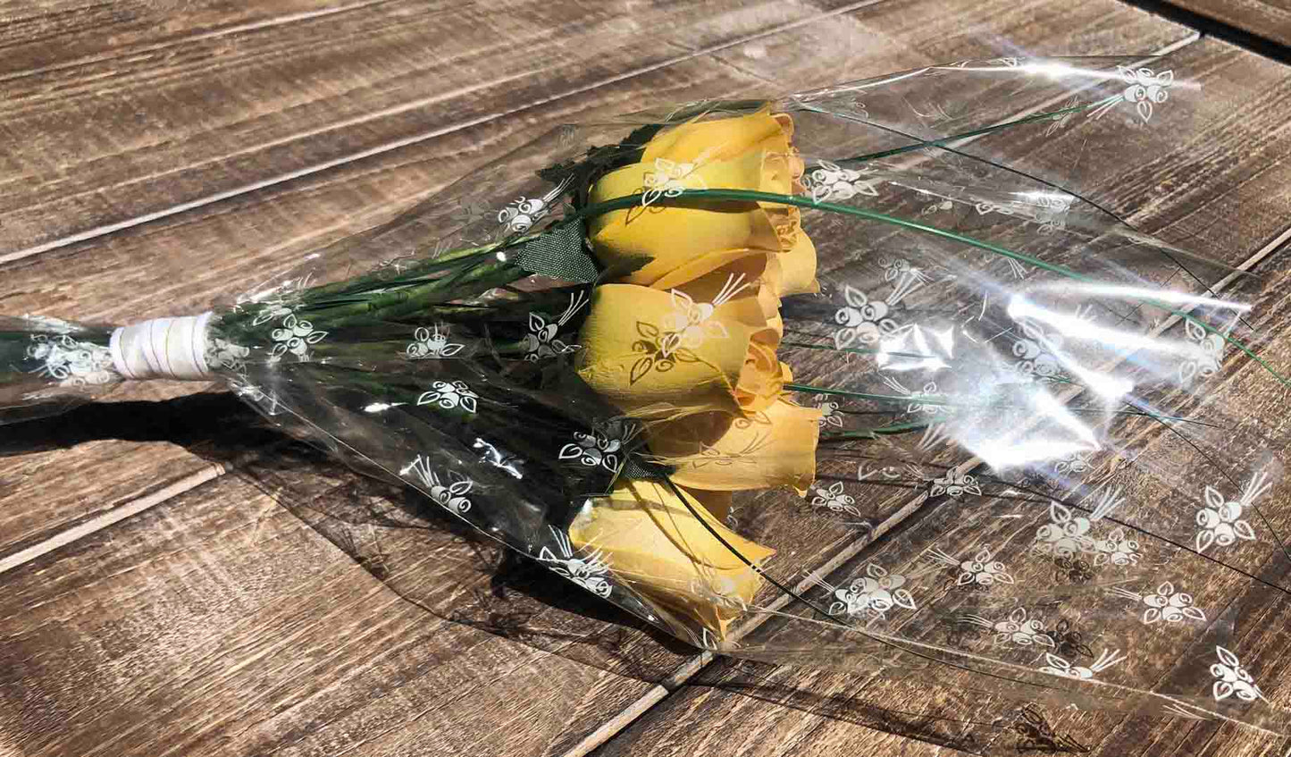 - Complete bouquet includes 12 light yellow rosebuds, onion grass, cellophane sleeve and white ribbon