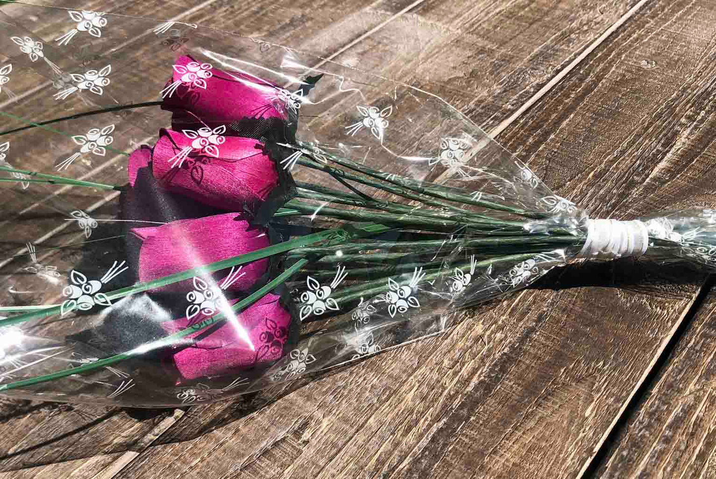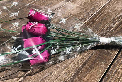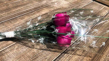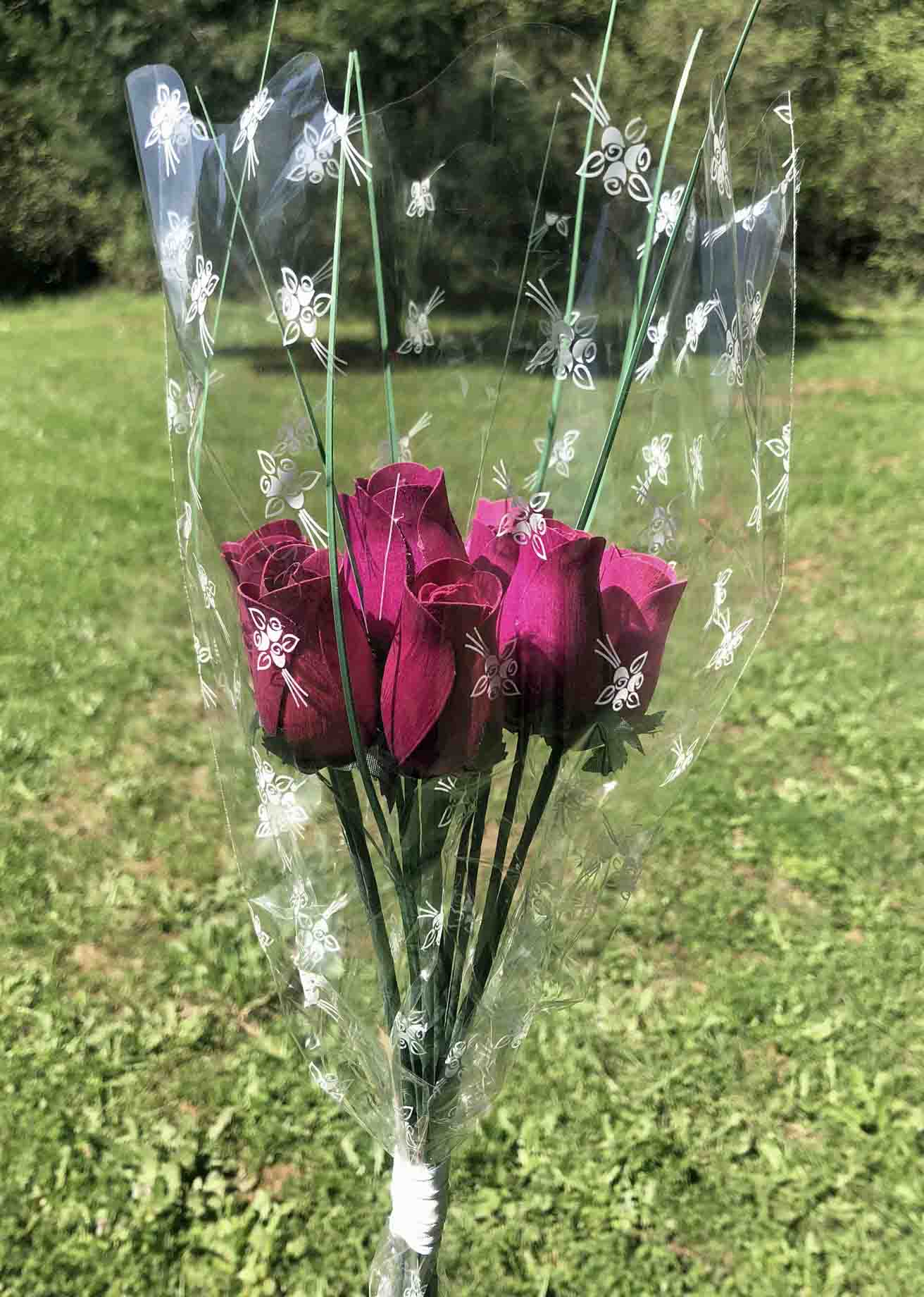 - Complete bouquet includes 12 violet rosebuds, onion grass, cellophane sleeve and ivory ribbon