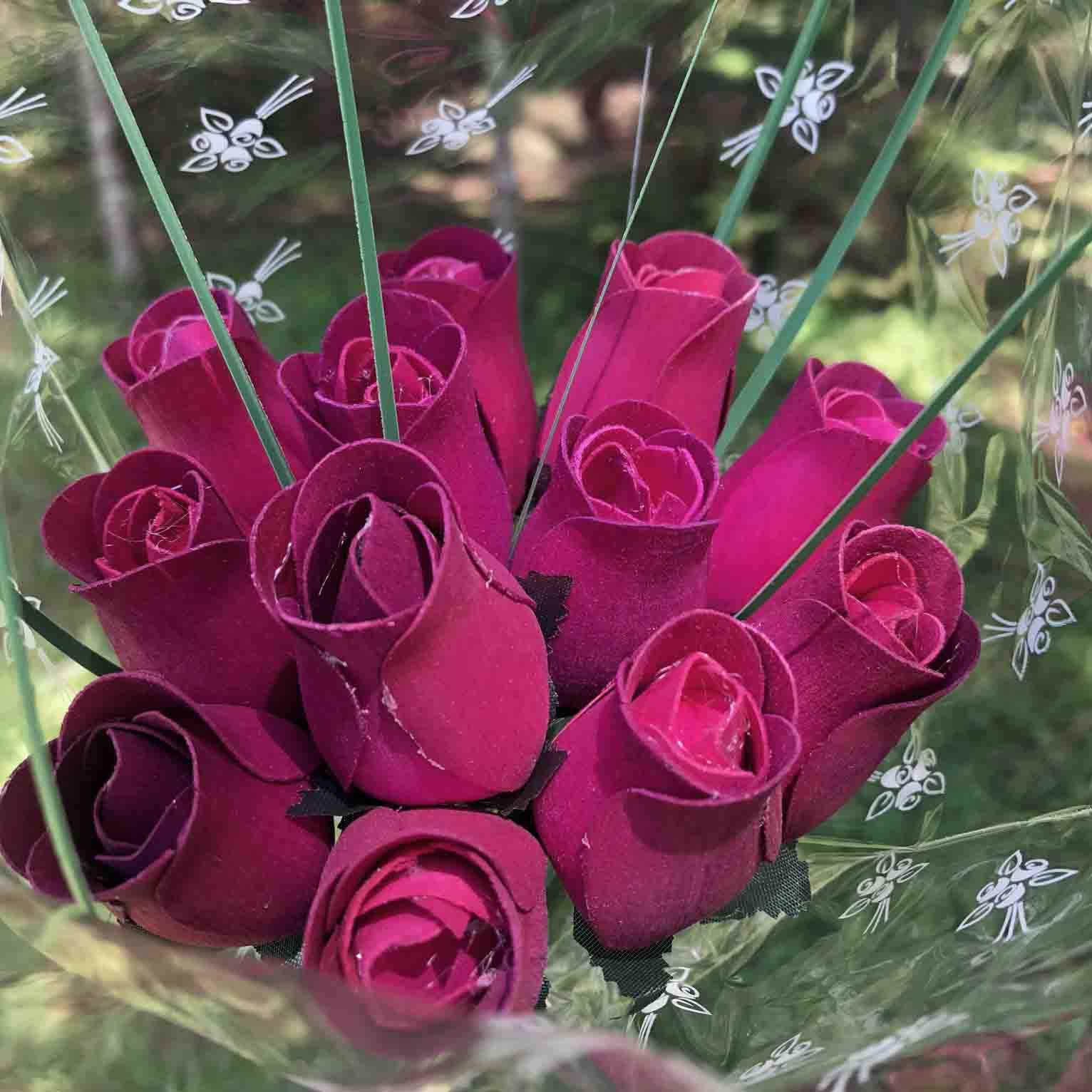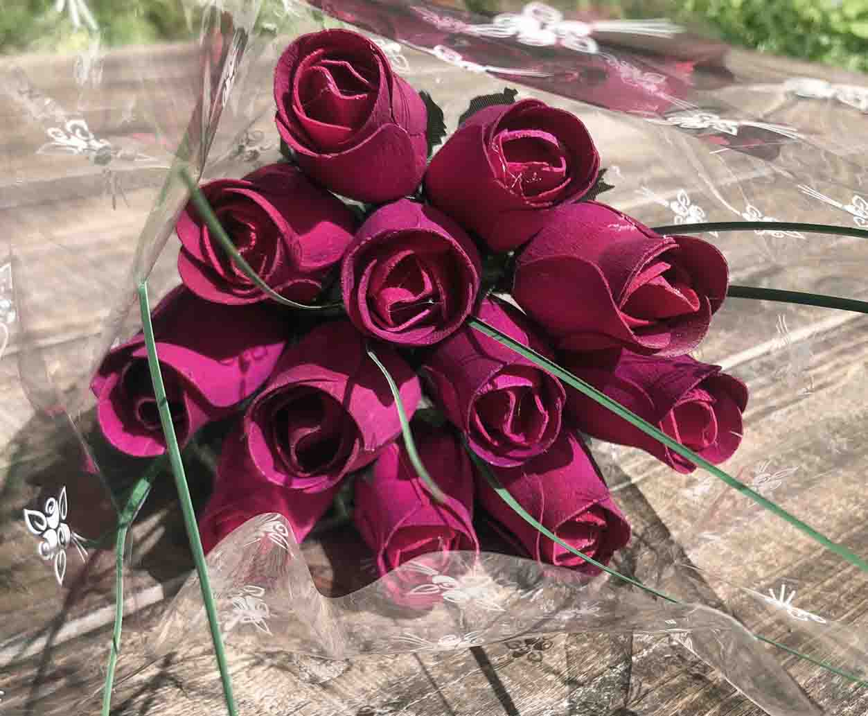Tired of your fresh flowers wilting? These roses make a beautiful decoration that lasts and lasts.These wooden rosebuds are made from thin pieces of birch wood. Each one goes through a dye process making each stem truly unique!