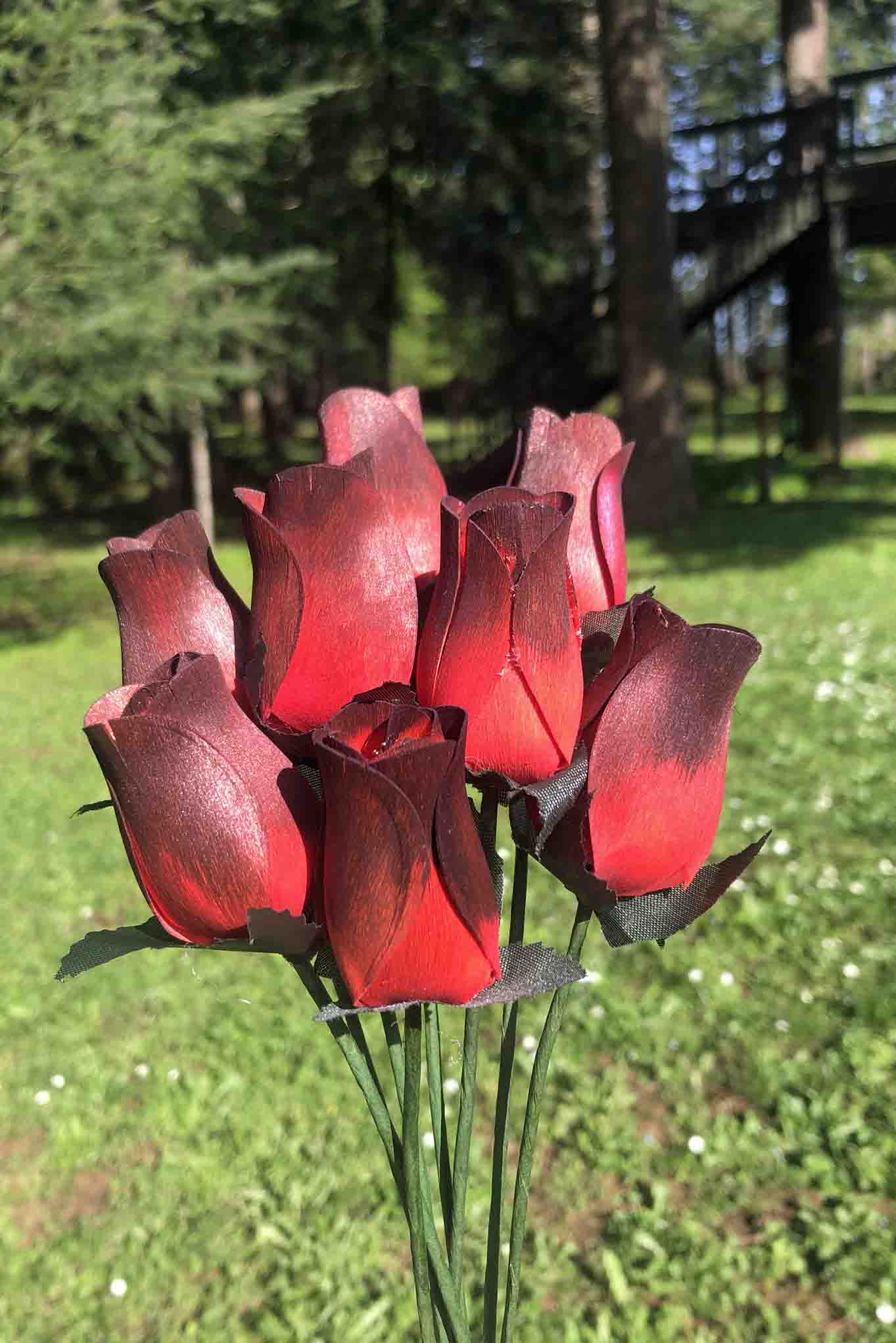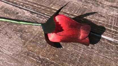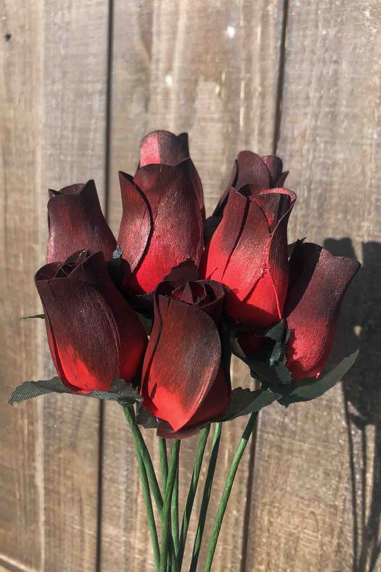 Tired of your fresh flowers wilting? Have a wedding or prom coming up? These roses make beautiful decorations, bouquets and centerpieces. These wooden rosebuds are made from thin pieces of birch wood. Each one goes through a dye process making each stem truly unique!