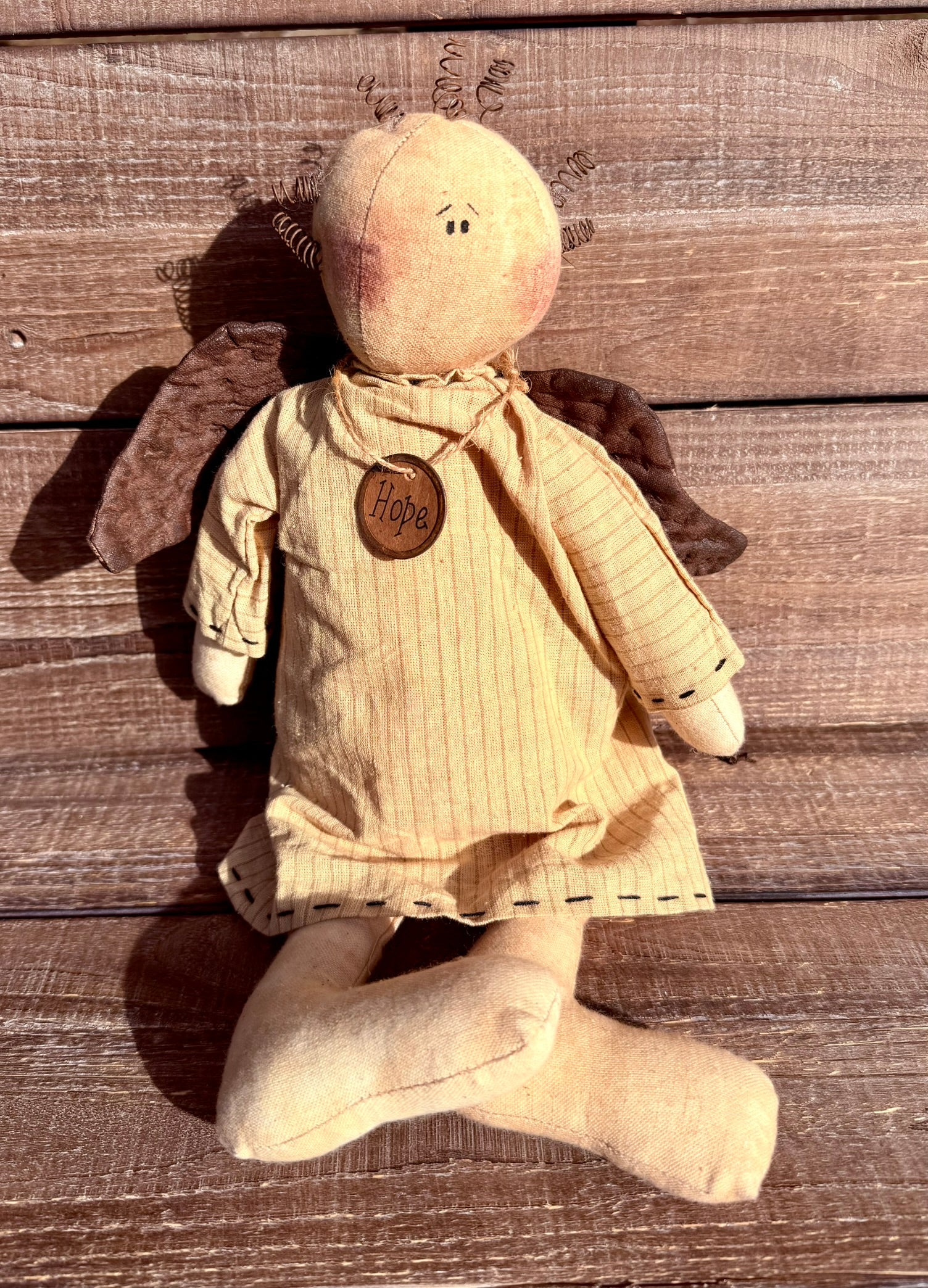 This charming angel brings a delightful touch of homespun shabby chic to any room in your home! With its cozy, handcrafted aesthetic, this sitting plush figure radiates warmth and whimsy while delivering an uplifting message of hope. Perfect for shelf displays, bedside tables, or as a thoughtful gift for someone who appreciates rustic charm and inspirational décor. Let this sweet companion remind you that magic and optimism are always within reach. A delightful addition to your collection of treasured keepsakes!